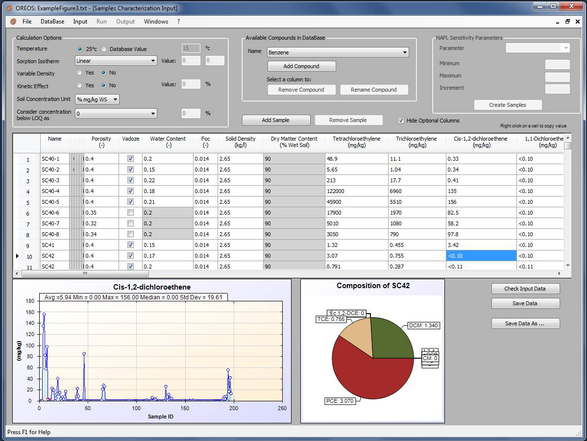 Le logiciel OREOS® calcule la répartition des polluants dans les différentes phases d’un échantillon de sol (eau, air, solide, phase organique) à partir des concentrations de polluants dans les sols, des propriétés pétrophysiques des sols (porosité, teneur en eau et en carbone organique) et des propriétés physico-chimiques des polluants en présence (masse molaire, densité liquide, solubilité, pression de vapeur, coefficient de partage eau / carbone organique).